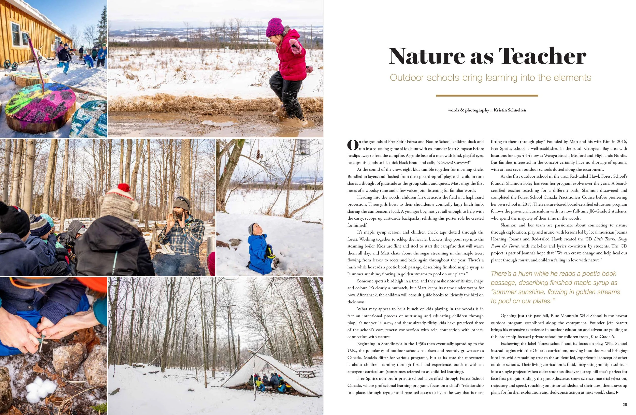 In Search of Lost OrchardsHighlighting a local cidery and its passionate owners.Mountain Life Magazine. A Year on the TrailHiking the Beaver Valley Section of the Bruce TrailMountain Life Magazine. Barn RebornTransformation of the Infinite Glassworks barn into a wicked glassblowing studioMountain Life Magazine. Self-Sufficient SanctuaryExploring a cordwood cabin and its off-grid propertyMountain Life Magazine. Nature as TeacherOutdoor Schools in the Southern Georgian Bay AreaMountain Life Magazine.